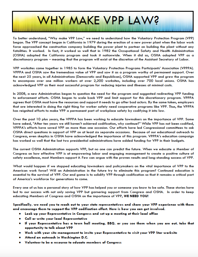 On behalf of the legislative & Regulatory committee, please see the attached “Why Codify VPP” handout and presentation for potential use at the regional conferences.